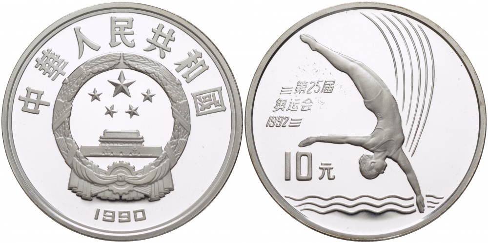 КИТАЙ 10 ЮАНЕЙ 1990 ОЛИМПИАДА 1992 В БАРСЕЛОНЕ, ПРЫЖКИ В ВОДУ KM 301 серебро PROOF 04-311-31
