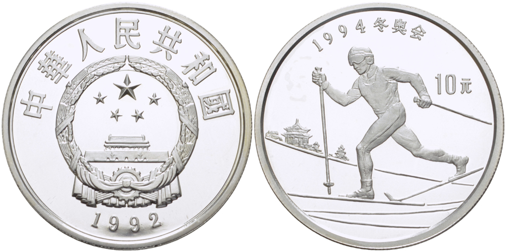 КИТАЙ 10 ЮАНЕЙ 1992 ЗИМНЯЯ ОЛИМПИАДА 1994, ЛЫЖИ KM 439 серебро PROOF 06-275-24