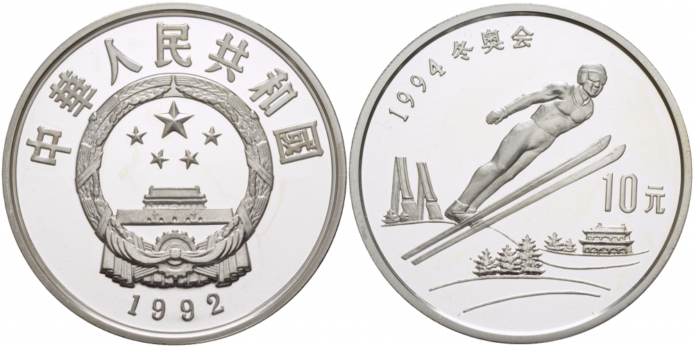 КИТАЙ 10 ЮАНЕЙ 1992 ЗИМНЯЯ ОЛИМПИАДА 1994, ПРЫЖКИ С ТРАМПЛИНА KM 438 серебро PROOF 04-311-43