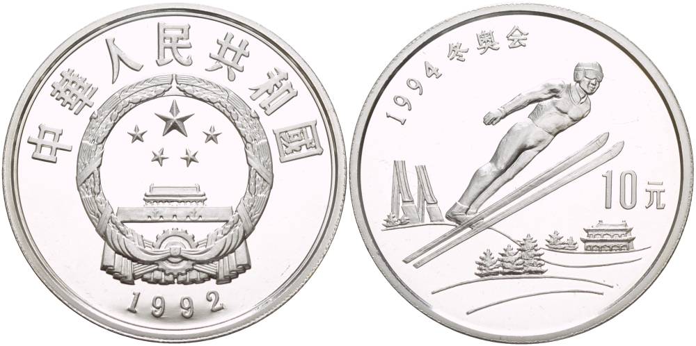 КИТАЙ 10 ЮАНЕЙ 1992 ЗИМНЯЯ ОЛИМПИАДА 1994, ПРЫЖКИ С ТРАМПЛИНА KM 438 серебро PROOF 1074-3-24