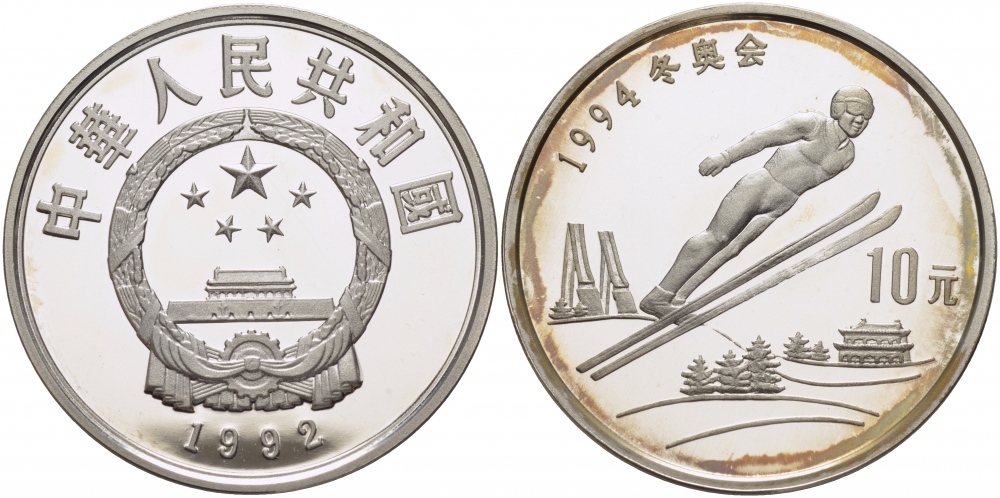 КИТАЙ 10 ЮАНЕЙ 1992 ЗИМНЯЯ ОЛИМПИАДА 1994, ПРЫЖКИ С ТРАМПЛИНА KM 438 серебро PROOF 1077-7-22