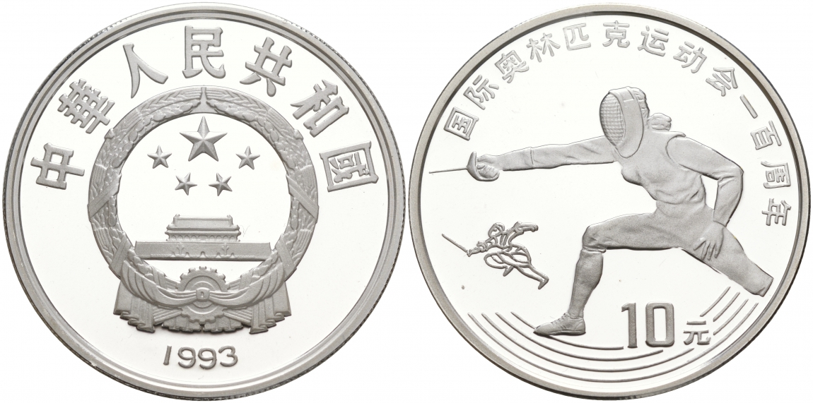 КИТАЙ 10 ЮАНЕЙ 1993 100 ЛЕТ ОЛИМПИЙСКОМУ ДВИЖЕНИЮ, ФЕХТОВАНИЕ KM 524 серебро PROOF 02-035-15