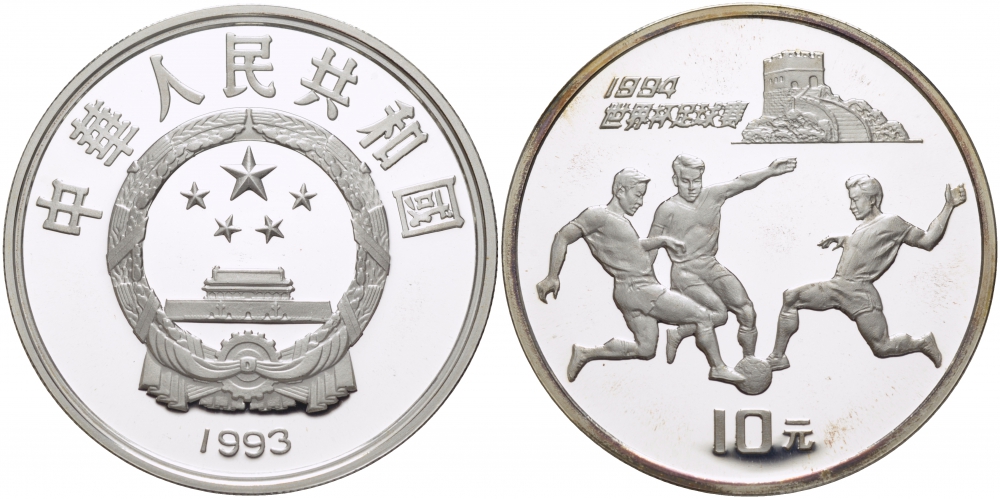 Китай 10 юаней 1993 футбол, три игрока KM 521 серебро PROOF 04-312-12