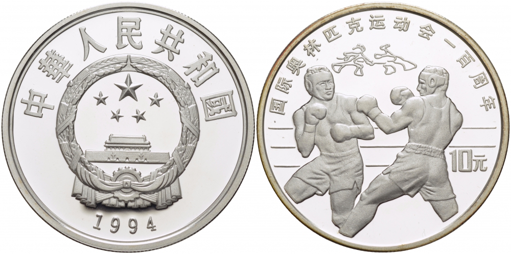 Китай 10 юаней 1994 олимпийские игры, бокс, тираж 30000 экземпляров KM 528 серебро PROOF 04-312-21