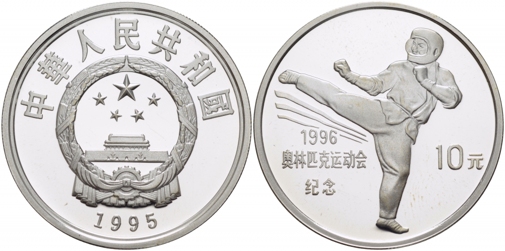 КИТАЙ 10 ЮАНЕЙ 1995 КИК БОКСЕР, тираж 30000 экземпляров KM 758 серебро PROOF 04-312-32