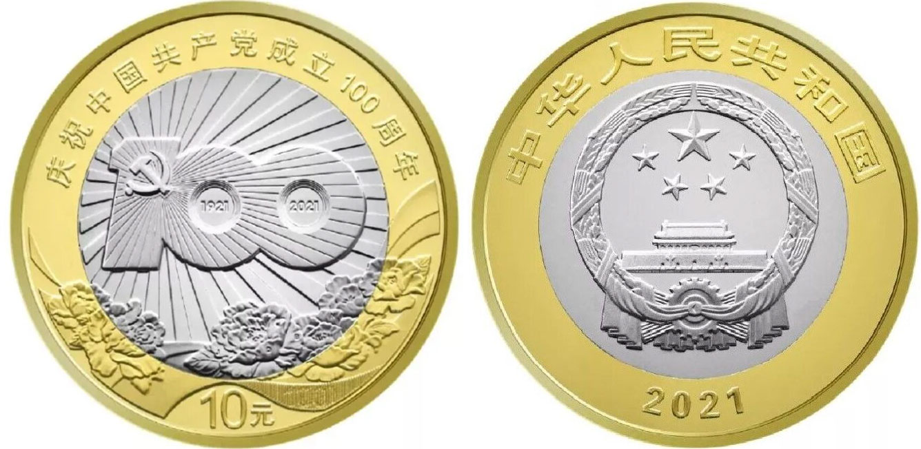 Китай 10 юаней 2021 100 лет Коммунистической партии Китая KM 2579 биметалл UNC 4633-516