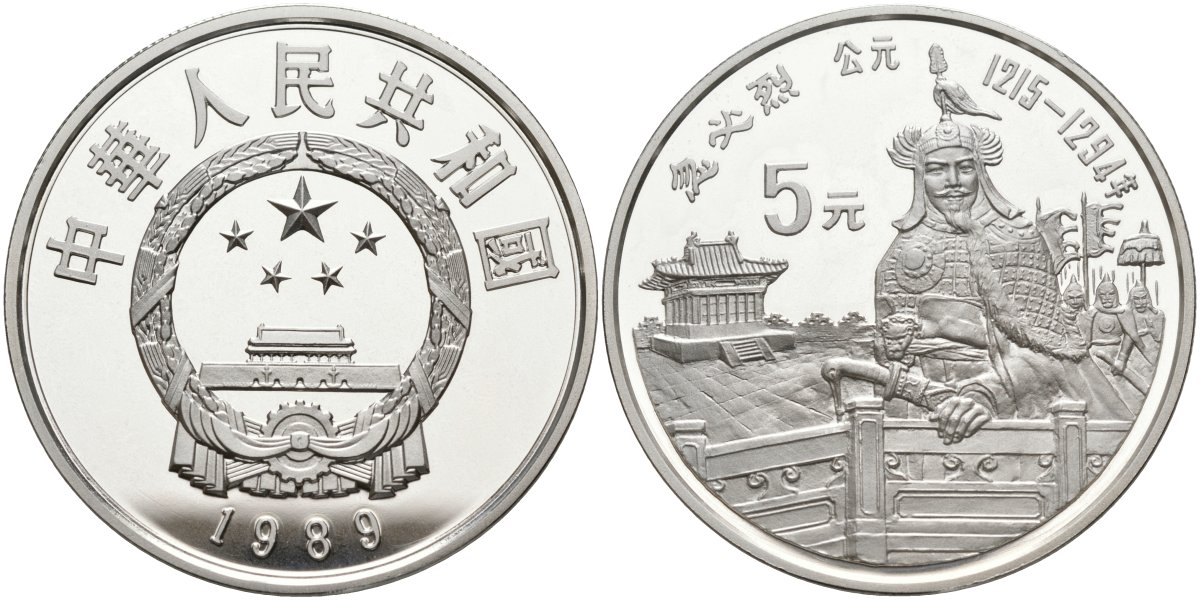 Китай 5 юаней 1989 Кублай-хан (1215-1294), тираж 10000 экземпляров KM 248 серебро PROOF 02-115-32