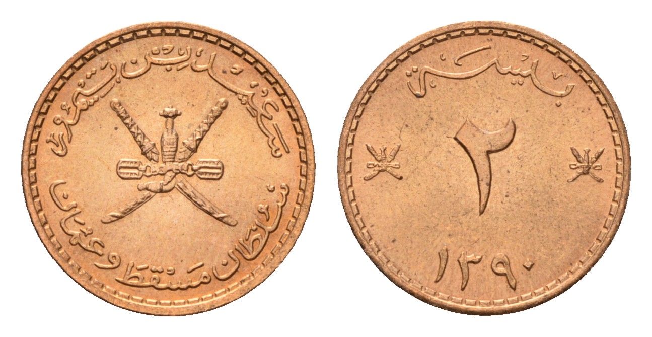 Оман 2 байзы 1970 AH 1390, Саид бен Таймур аль-Саид (1932-1970) KM 36 бронза UNC 4588-848