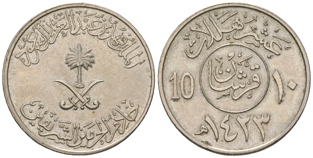 Саудовская Аравия 10 халалов 2002 AH 1423, Фахд ибн Абдул-Азиз Аль Сауд (1982-2005) KM 62 медно-никель 4591-341