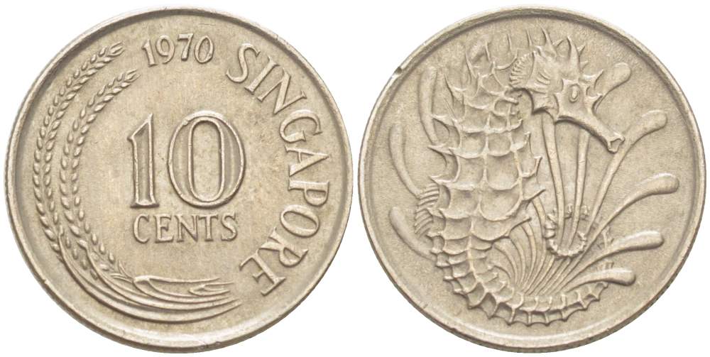 Сингапур 10 центов 1970 морской конек KM 3 медно-никель 4523-234