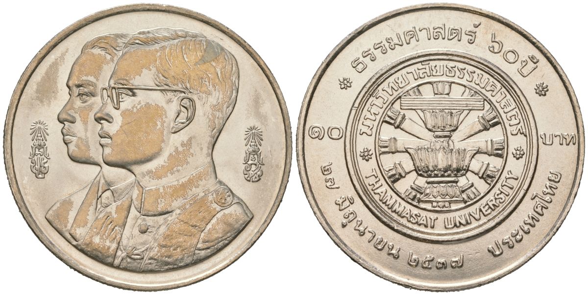 Таиланд 10 бат 1994 BE 2537, Рама IX (1946-2016), 60 лет Университету Таммасат KM 297 медно-никель UNC 4149-743