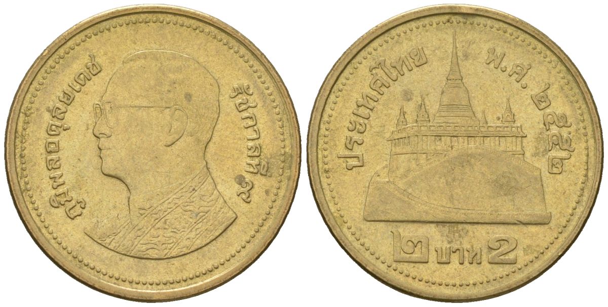 Таиланд 2 бата 2009 BE 2552, Рама IX (1946-2016) KM 445 алюминиевая бронза 4610-1216