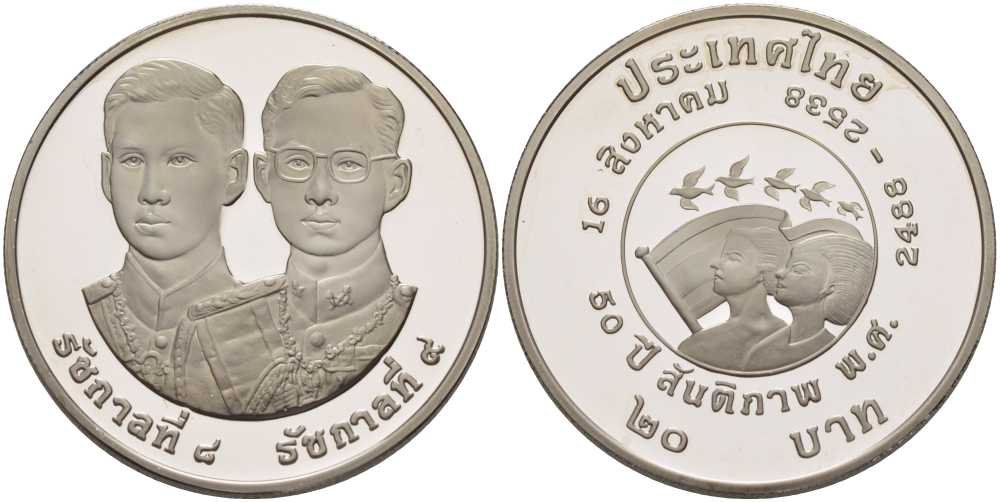 ТАИЛАНД 20 БАТ 1995 50 ЛЕТ ПОДПИСАНИЯ МИРНОГО ДОГОВОРА 1945 ГОДА ОБ ОКОНЧАНИИ ВТОРОЙ МИРОВОЙ ВОЙНЫ, КОРОЛИ РАМА VIII И РАМА IX В ВОЕННЫХ МУНДИРАХ, МОНЕТА В КАПСУЛЕ, С СЕРТИФИКАТОМ, ТИРАЖ 20000 ЭКЗ. KM 338 медно-никель PROOF 5-4-2-1