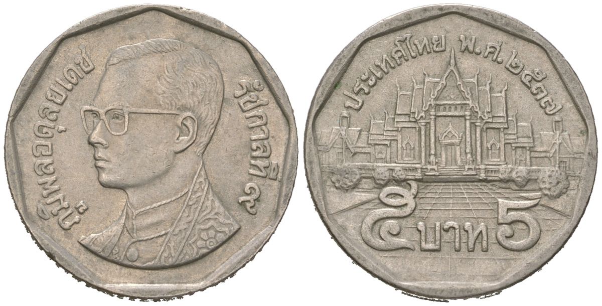 Таиланд 5 бат 1994 BE 2537, Рама IX (1946-2016) KM 219 медь плакированная медно-никелем aUNC 4592-1154