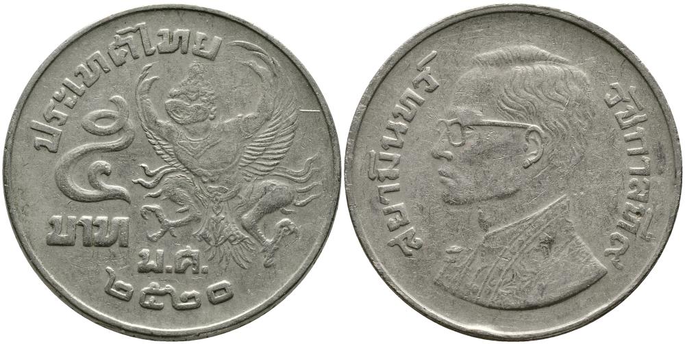 ТАИЛАНД 5 БАТОВ 1977 ВЕ 2520, РАМА IX, МИФИЧЕСКОЕ БОЖЕСТВО " GERUDA" (ГАРУДА - ЦАРЬ ПТИЦ) KM 111 медно-никель 4542-611