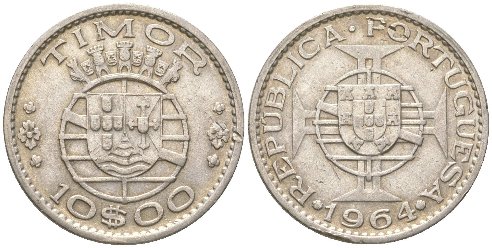 Португальский Тимор 10 эскудо 1964 год тип KM 16 серебро 4187-325