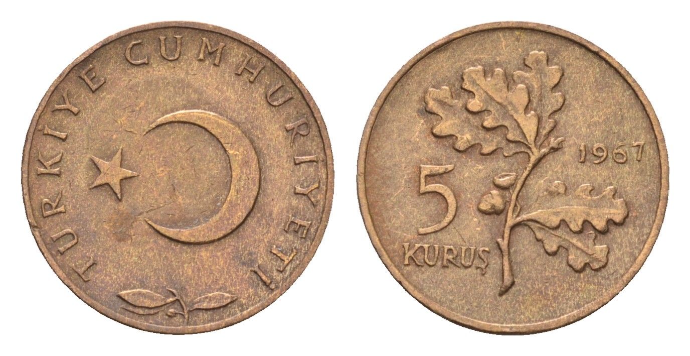Турция 5 курушей 1967 KM 890.1 бронза 4674-918