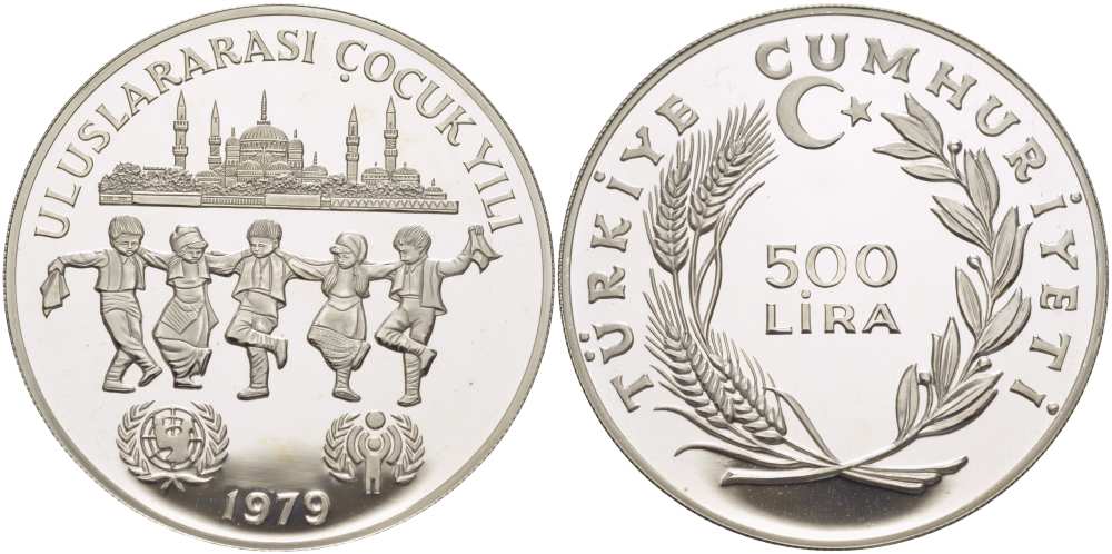 Турция 500 лир 1979 (1981) ЮНИСЕФ, UNICEF, международный год детей, дети танцуют на фоне мечети KM 931 серебро PROOF 01-148-42
