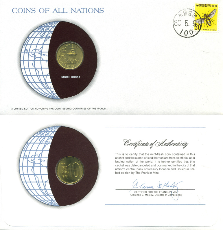 ЮЖНАЯ КОРЕЯ 10 ВОН 1979 КОНВЕРТ С МАРКОЙ ПЕРВОГО ДНЯ ГАШЕНИЯ, COINS OF NATIONS KM 6а латунь UNC 4294-32-1