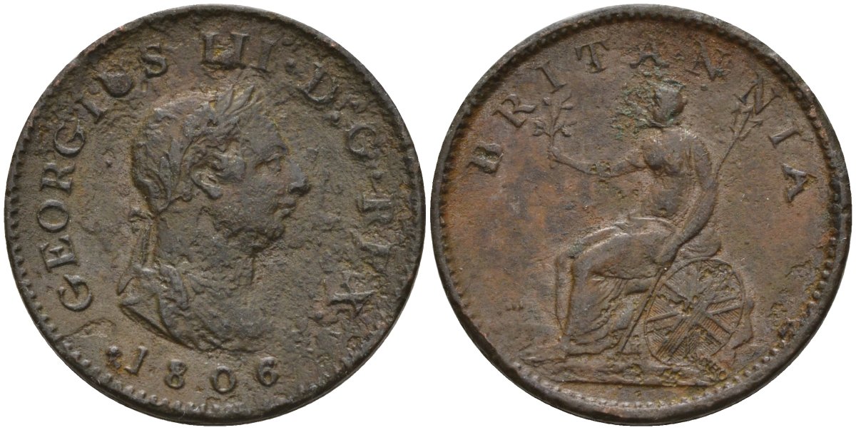 Великобритания 1 фартинг 1806 Георг III (1760 - 1820) KM 661 медь 4146-356