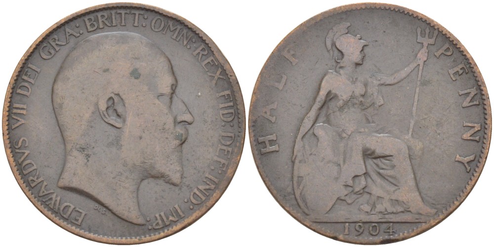 АНГЛИЯ 1/2 ПЕННИ 1904 ЭДУАРД VII (1901-1910) KM 793.2, Spink 3991 бронза 175-152