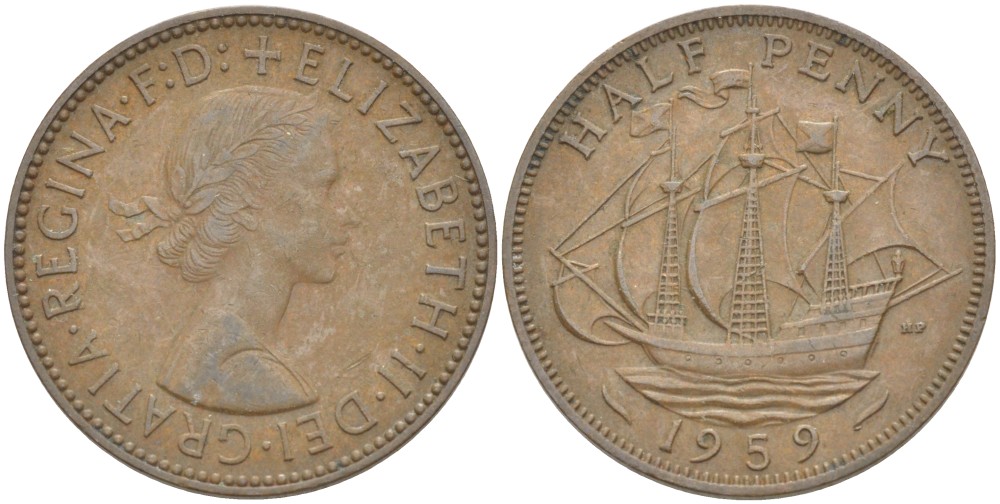 АНГЛИЯ 1/2 ПЕННИ 1959 ЕЛИЗАВЕТА II (1952-) KM 896, Spink 4178 бронза 4544-124