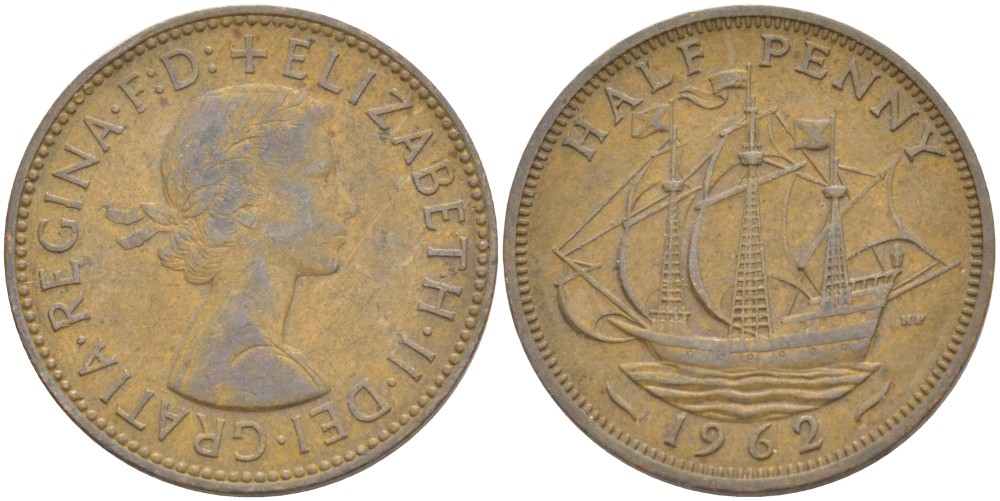 АНГЛИЯ 1/2 ПЕННИ 1962 ЕЛИЗАВЕТА II (1952-) KM 896, Spink 4178 бронза 4544-133