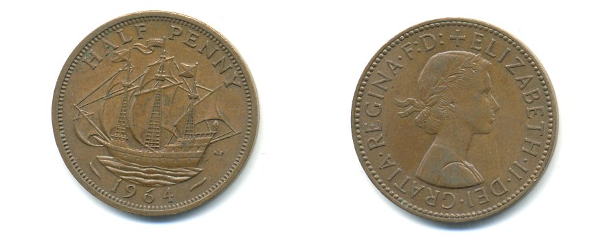 АНГЛИЯ 1/2 ПЕННИ 1964 ЕЛИЗАВЕТА II KM 896, Spink 4158 бронза 59-1212