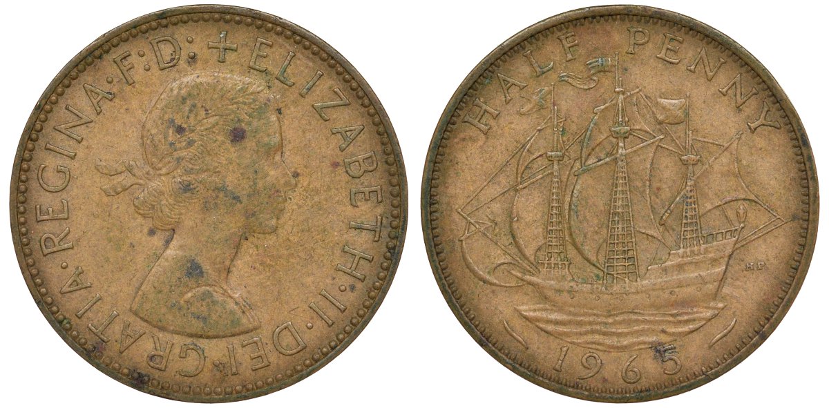 Великобритания 1/2 пенни 1965 Елизавета II (1952-2022) KM 896, Spink 4158 бронза 72-232