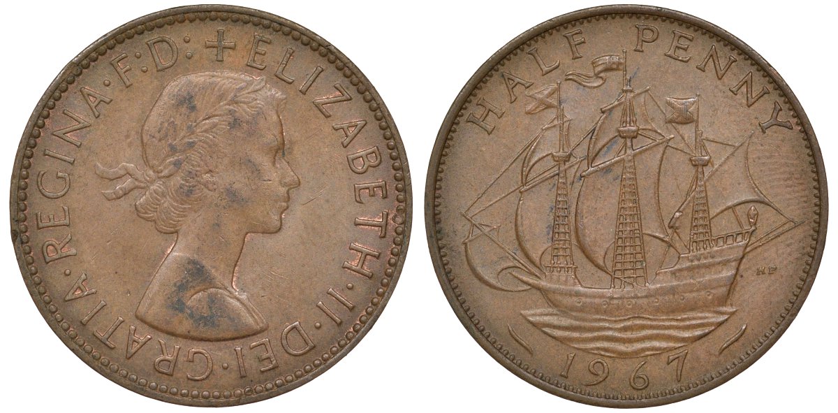 Великобритания 1/2 пенни 1967 Елизавета II (1952-2022) KM 896, Spink 4158 бронза 72-413