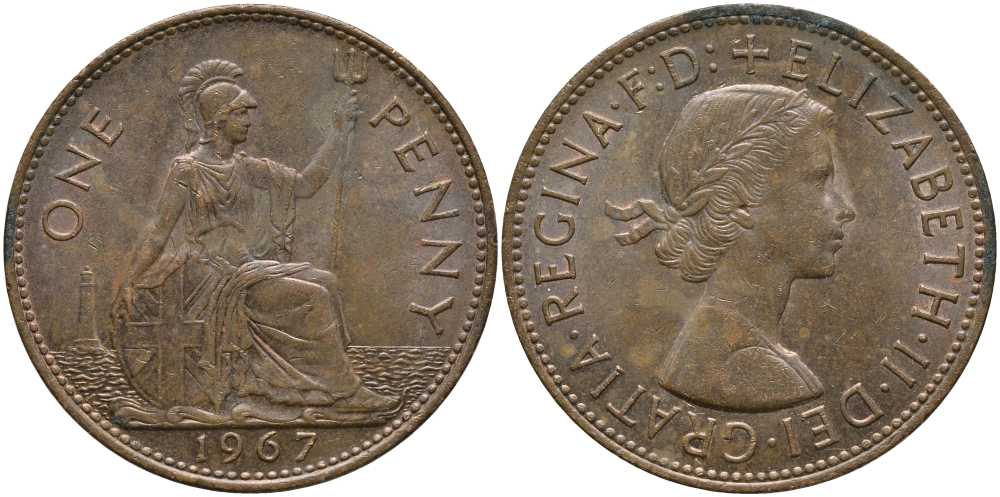 АНГЛИЯ 1 ПЕННИ 1967 ЕЛИЗАВЕТА II (1952-) КМ 897, Spink 4157 бронза 115-511