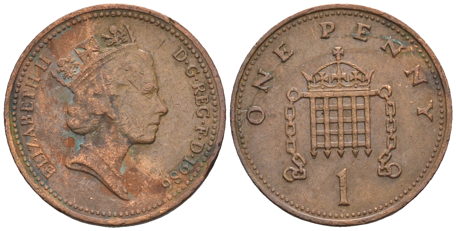 Великобритания 1 пенни 1986 Елизавета II (1952-2022) KM 935, Spink 4381 (B3) бронза 4609-519