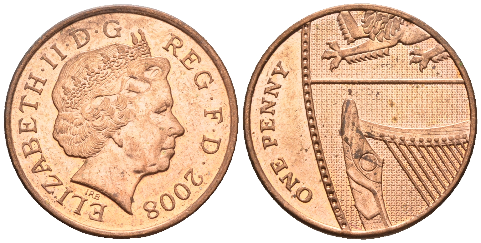 Великобритания 1 пенни 2008 Елизавета II (1952-2022) KM 1107, Spink B6 сталь плакированная медью 4609-644