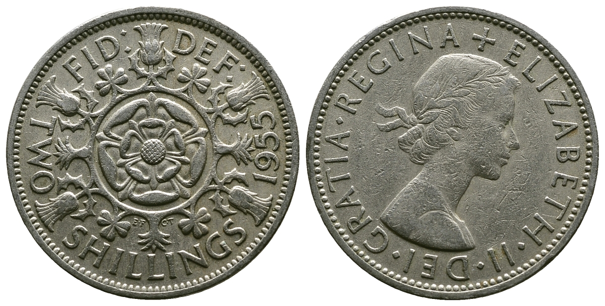 Великобритания 2 шиллинга (флорин) 1955 Елизавета II (1952-2022) KM 906, Spink 4146 медно-никель 4607-916
