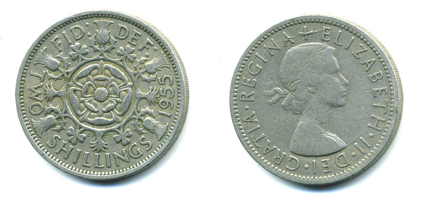 АНГЛИЯ 2 ШИЛЛИНГА = 1 ФЛОРИН 1955 ЕЛИЗАВЕТА II KM 906, Spink 4146 медно-никель 4383-841