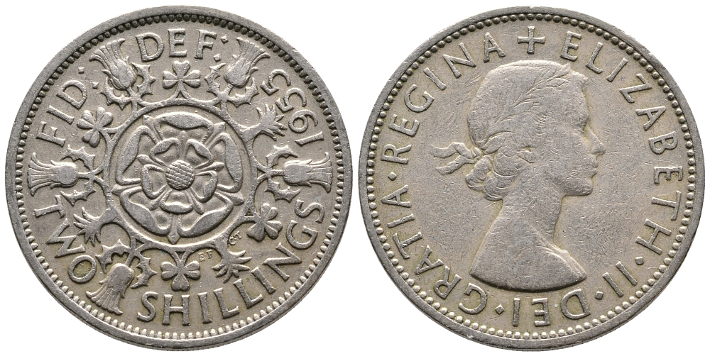 Великобритания 2 шиллинга (флорин) 1955 Елизавета II (1952-2022) KM 906, Spink 4146 медно-никель 59-1526
