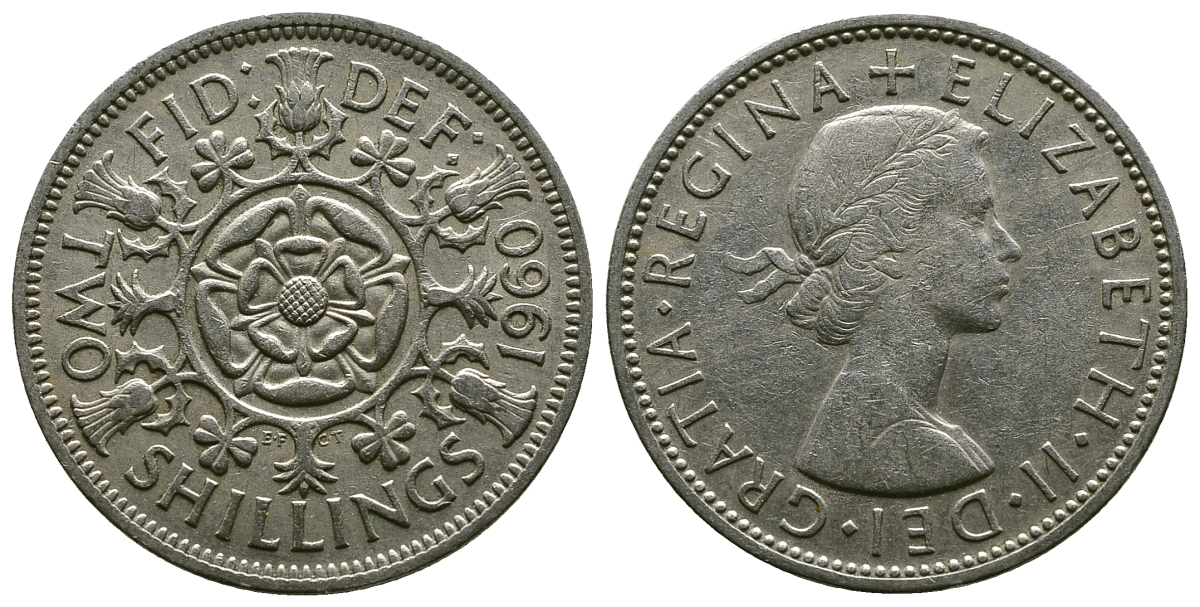 Великобритания 2 шиллинга (флорин) 1960 Елизавета II (1952-2022) KM 906, Spink 4146 медно-никель 4382-226