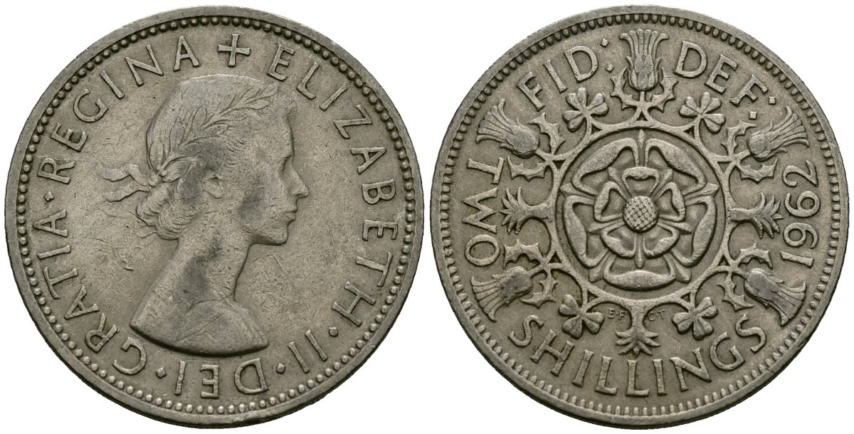 Англия 2 шиллинга = 1 флорин 1962 королева Елизавета II (1952-) KM 906, Spink 4146 медно-никель 4120-832