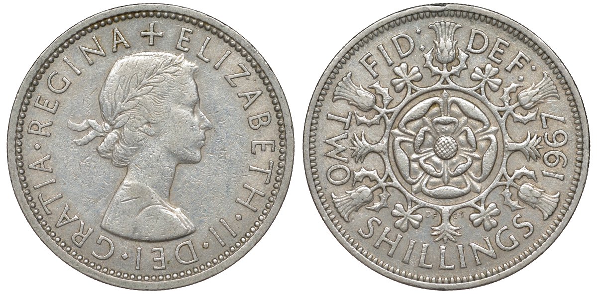 Великобритания 2 шиллинга (флорин) 1967 Елизавета II (1952-2022) KM 906, Spink 4146 медно-никель 51-2741