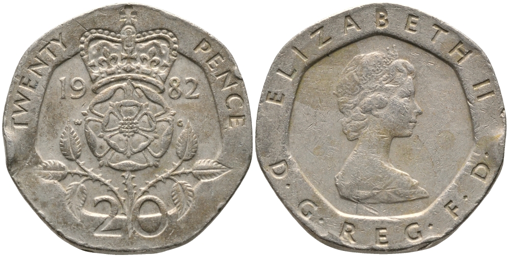 Великобритания 20 пенсов 1982 Елизавета II (1952-2022) KM 931, Spink 4230 (G1) медно-никель 65-956