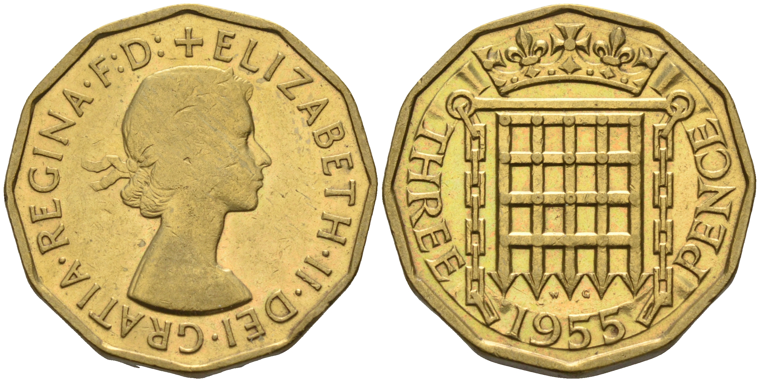 АНГЛИЯ 3 ПЕНСА 1955 ЕЛИЗАВЕТА II (1952-) KM 900, Spink 4153 никель латунь 4592-422