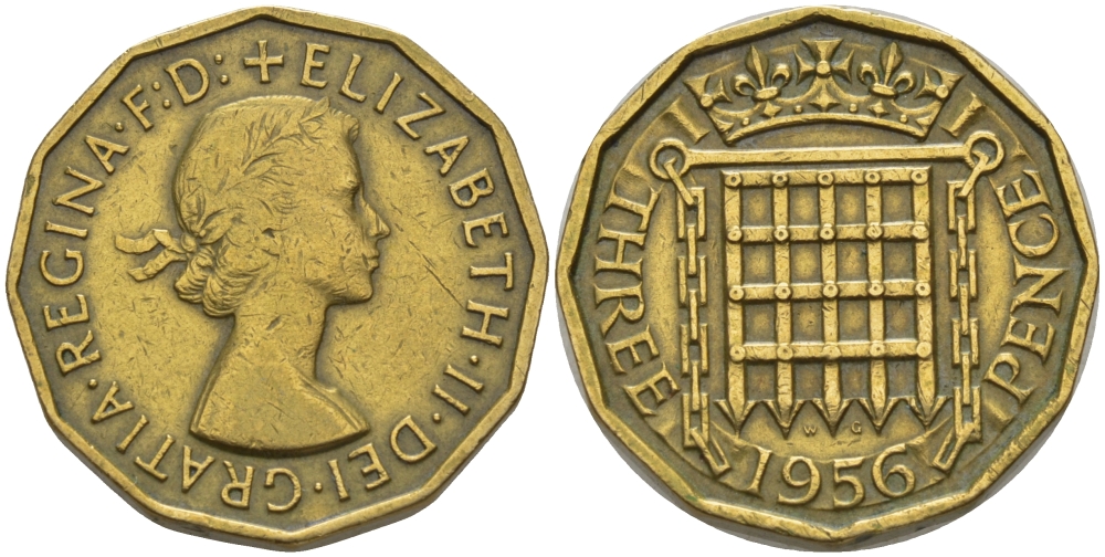 Великобритания 3 пенса 1956 Елизавета II (1952-2022) KM 900, Spink 4153 никель латунь 67-831