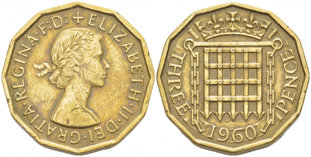 АНГЛИЯ 3 ПЕНСА 1960 ЕЛИЗАВЕТА II (1952-) KM 900, Spink 4153 никель латунь 77-154