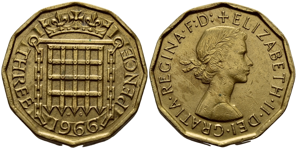 Великобритания 3 пенса 1966 Елизавета II (1952-2022) KM 900, Spink 4153 никель латунь 37-1232