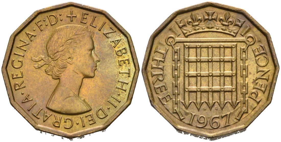 Англия 3 пенса 1967 Елизавета II KM 900, Spink 4153 никель латунь 4561-1041