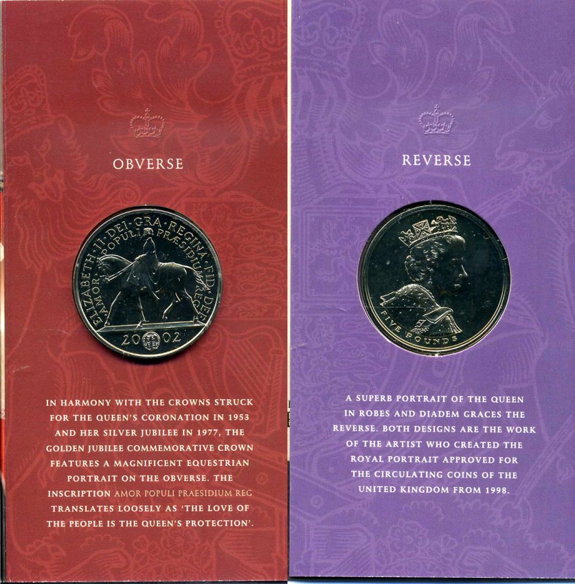 Великобритания 5 фунтов 2002 Елизавета II (1952-2022), Золотой юбилей правления Королевы Елизаветы II, запайка, в оригинальном картонном буклете KM 1024, Spink L10 медно-никель BUNC 5-4-4-35