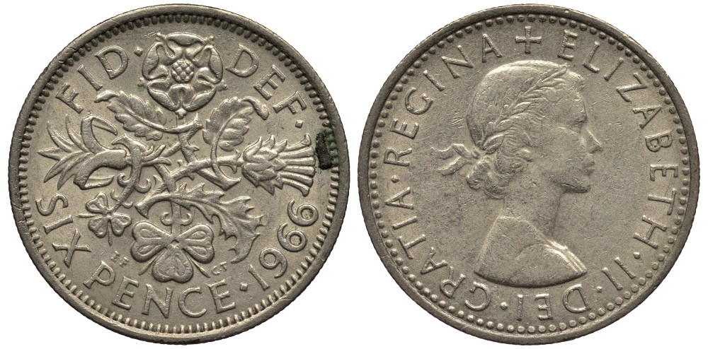 Великобритания 6 пенсов 1966 Елизавета II (1952-2022) KM 903, Spink 4149 медно-никель 4538-652