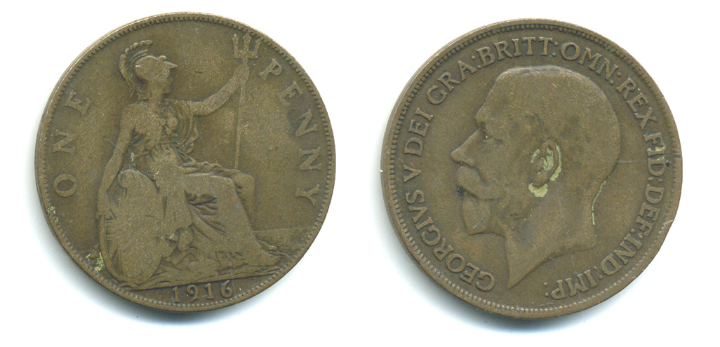 Великобритания 1 пенни 1916 Георг V (1910-1936) KM 810, Spink 4051 бронза 4383-511