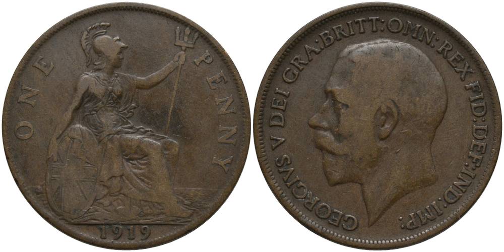 Великобритания 1 пенни 1919 Георг V (1910-1936) KM 810, Spink 4051 бронза 69-821