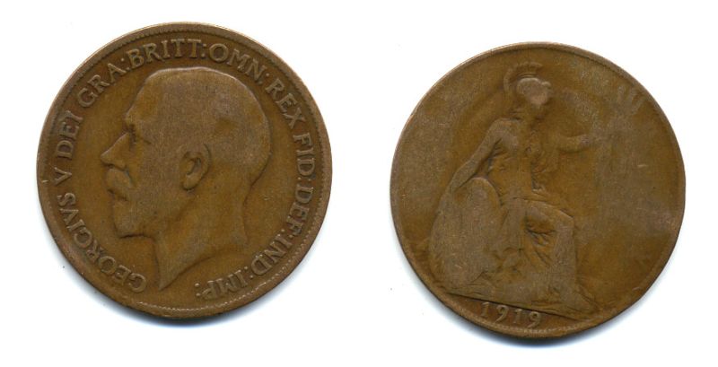 Великобритания 1 пенни 1919 Георг V (1910-1936) КМ 810, Spink 4051 бронза 47-321